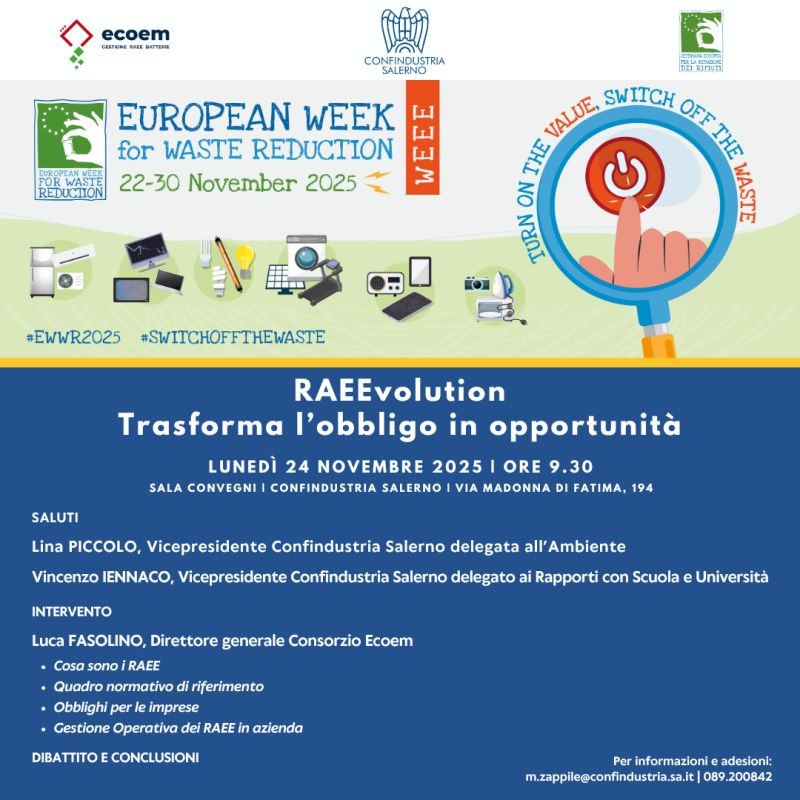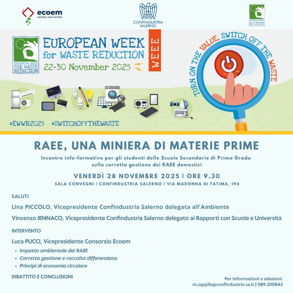 La SERR (European Week for Waste Reduction – EWWR) è la più grande campagna europea di sensibilizzazione ambientale sulla riduzione dei rifiuti e siamo felici di incontrare i più giovani per dare loro informazioni utili e rispondere a tutte le domande e curiosità. Il 28 novembre si terrà presso la sede di Confindustria Salerno, l’incontro […]